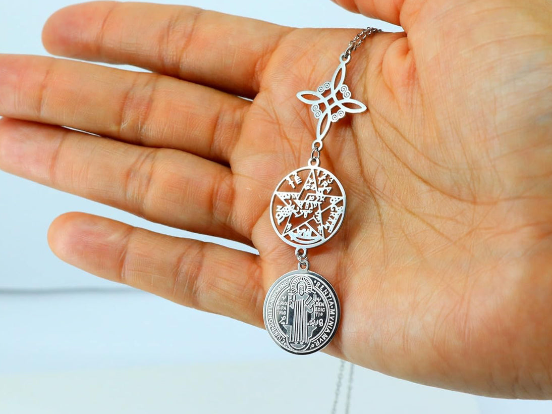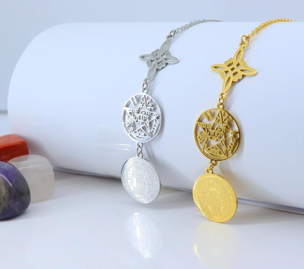 El conjunto del nudo de bruja con el tetragramaton y la cruz de san Benito hace que este collar tenga un superpoder protector de baja vibra y bloqueo de envidias.